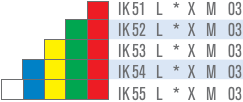 Приклад і розшифровка позначення: IK53L024XM03 - Світлова колона діаметр 50мм, 3 яруса (червоний, зелений, жовтий), світлодіоди 24В DC алюмінієвий патрубок 100мм